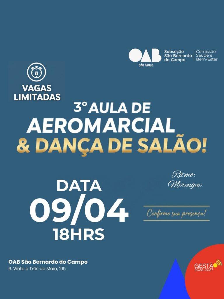 08 abr 3° AULA DE AEROMARCIAL & DANÇA DE SALÃO! Posted at 08:29h in Eventos, Principais by oab 0 Likes Inscrever-se
