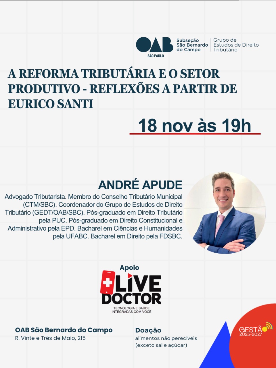 14 out A REFORMA TRIBUTÁRIA E O SETOR PRODUTIVO – REFLEXÕES A PARTIR DE EURICO SANTI Posted at 06:33h in Eventos, Principais by oab 0 Likes Inscrever-se