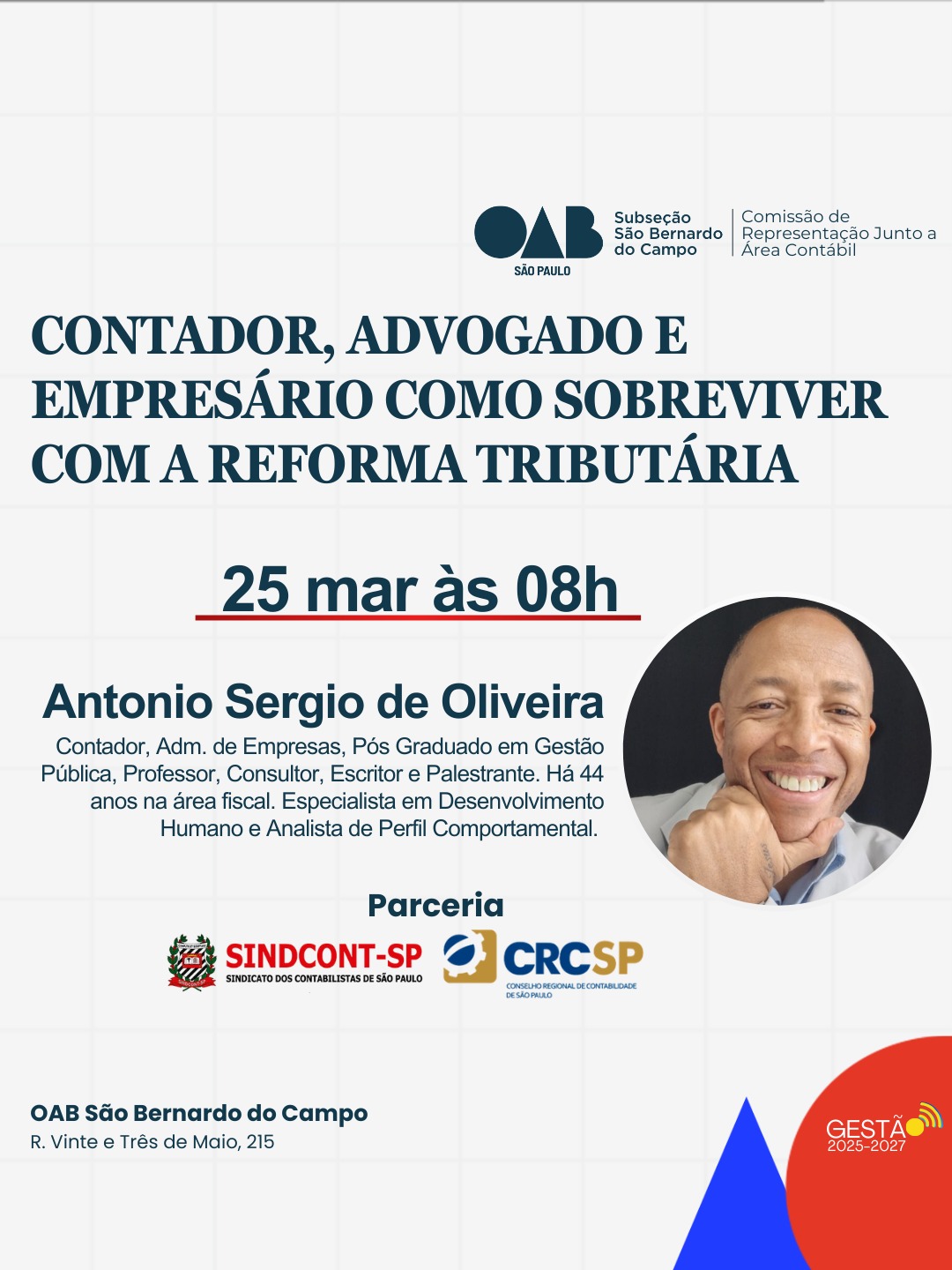 20 mar CONTADOR, ADVOGADO E EMPRESÁRIO COMO SOBREVIVER COM A REFORMA TRIBUTÁRIA Posted at 09:03h in Eventos, Principais by oab 0 Likes Inscrever-se