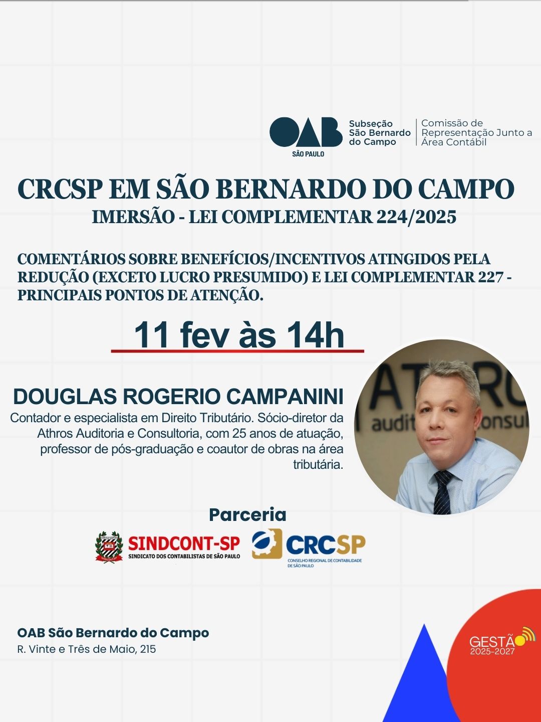 29 jan CRCSP EM SÃO BERNARDO DO CAMPO IMERSÃO – LEI COMPLEMENTAR 224/2025 Posted at 17:10h in Eventos, Principais by oab 0 Likes Inscrever-se