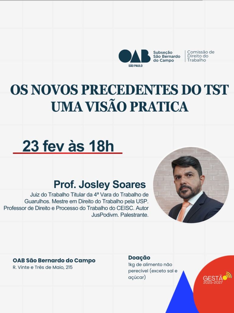 06 fev OS NOVOS PRECEDENTES DO TST UMA VISÃO PRATICA Posted at 09:33h in Eventos, Principais by oab 0 Likes Inscrever-se
