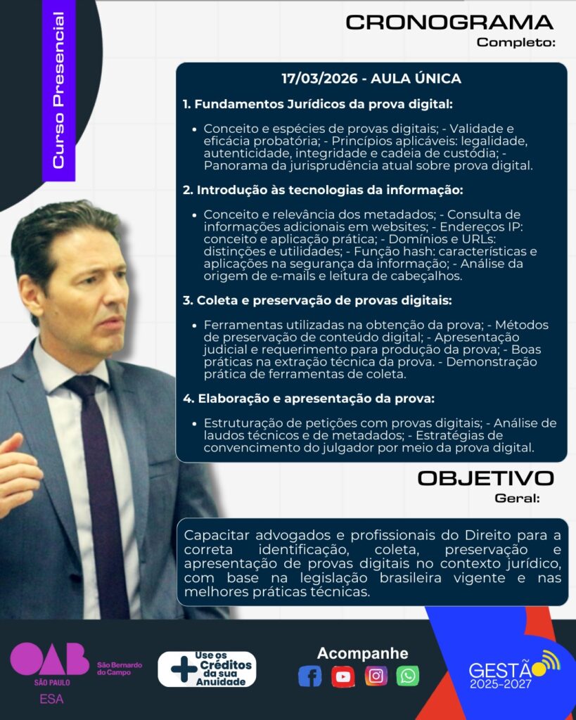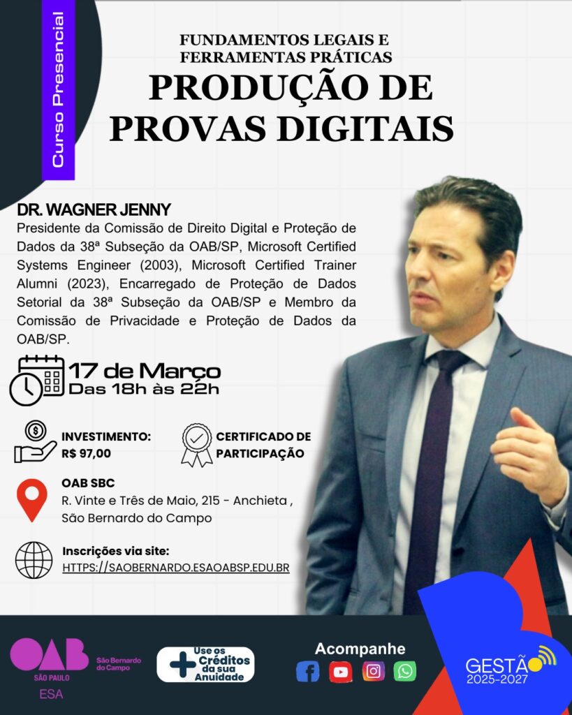 06 fev PRODUÇÃO DE PROVAS DIGITAIS – FUNDAMENTOS LEGAIS E FERRAMENTAS PRÁTICAS Posted at 09:35h in Eventos, Principais by oab 0 Likes Inscrever-se